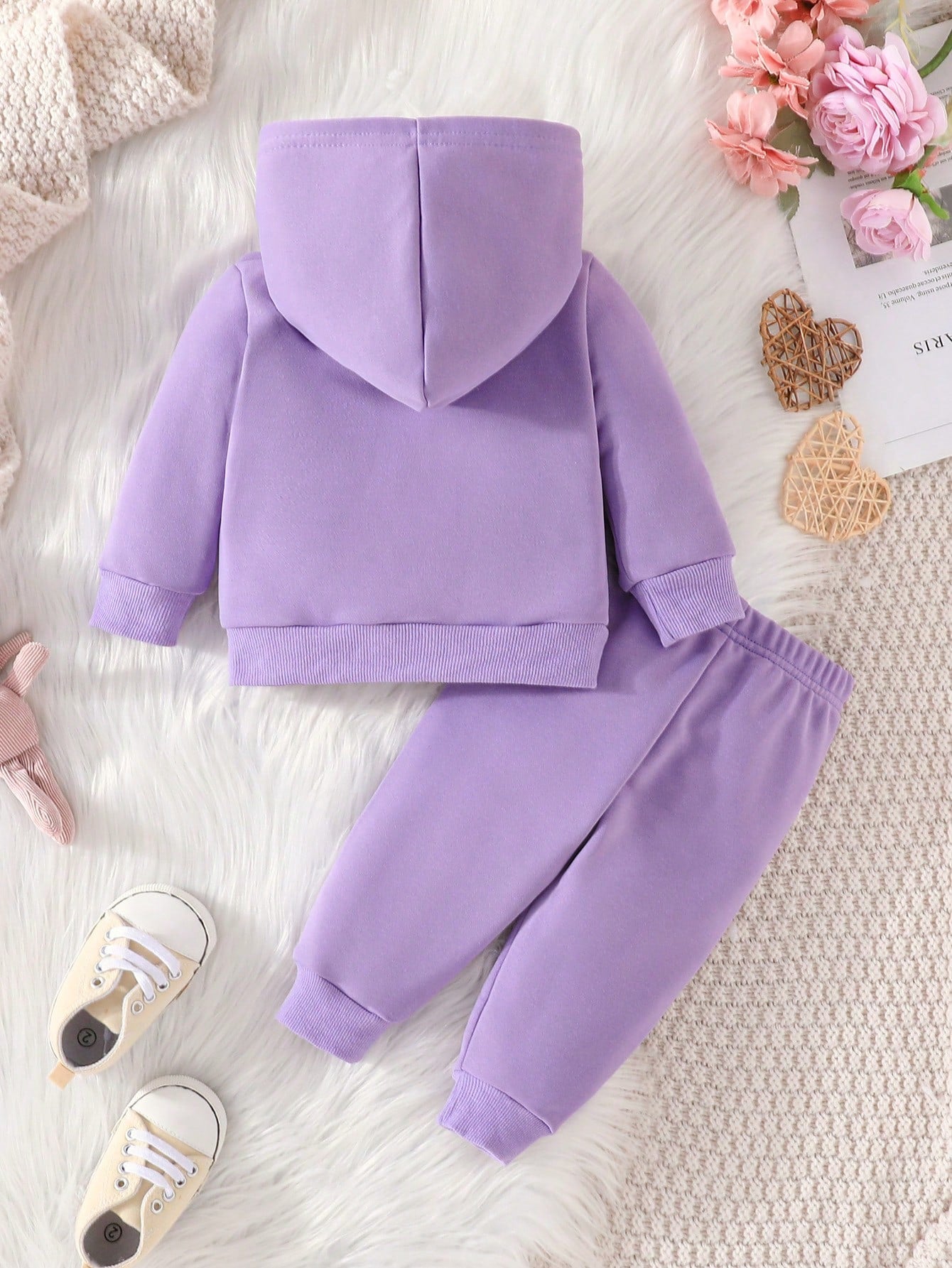 Soft Plush Hooded Fleece Shirt & Trouser Set, Basic Heart Design